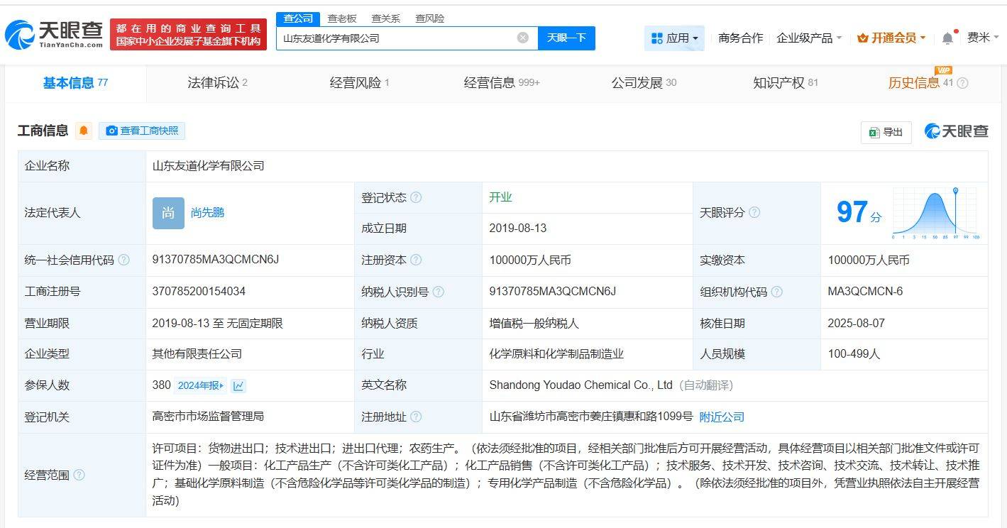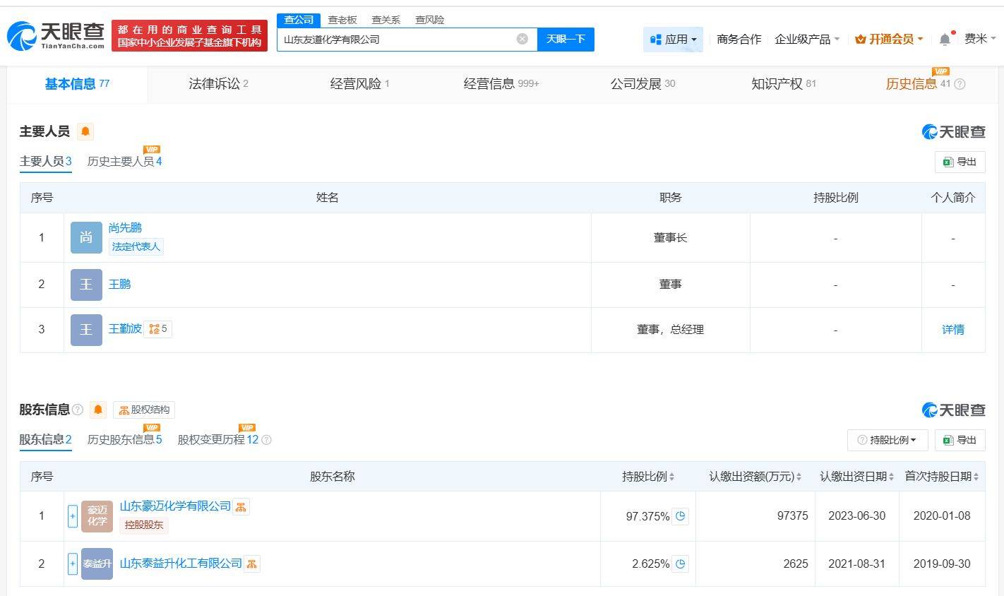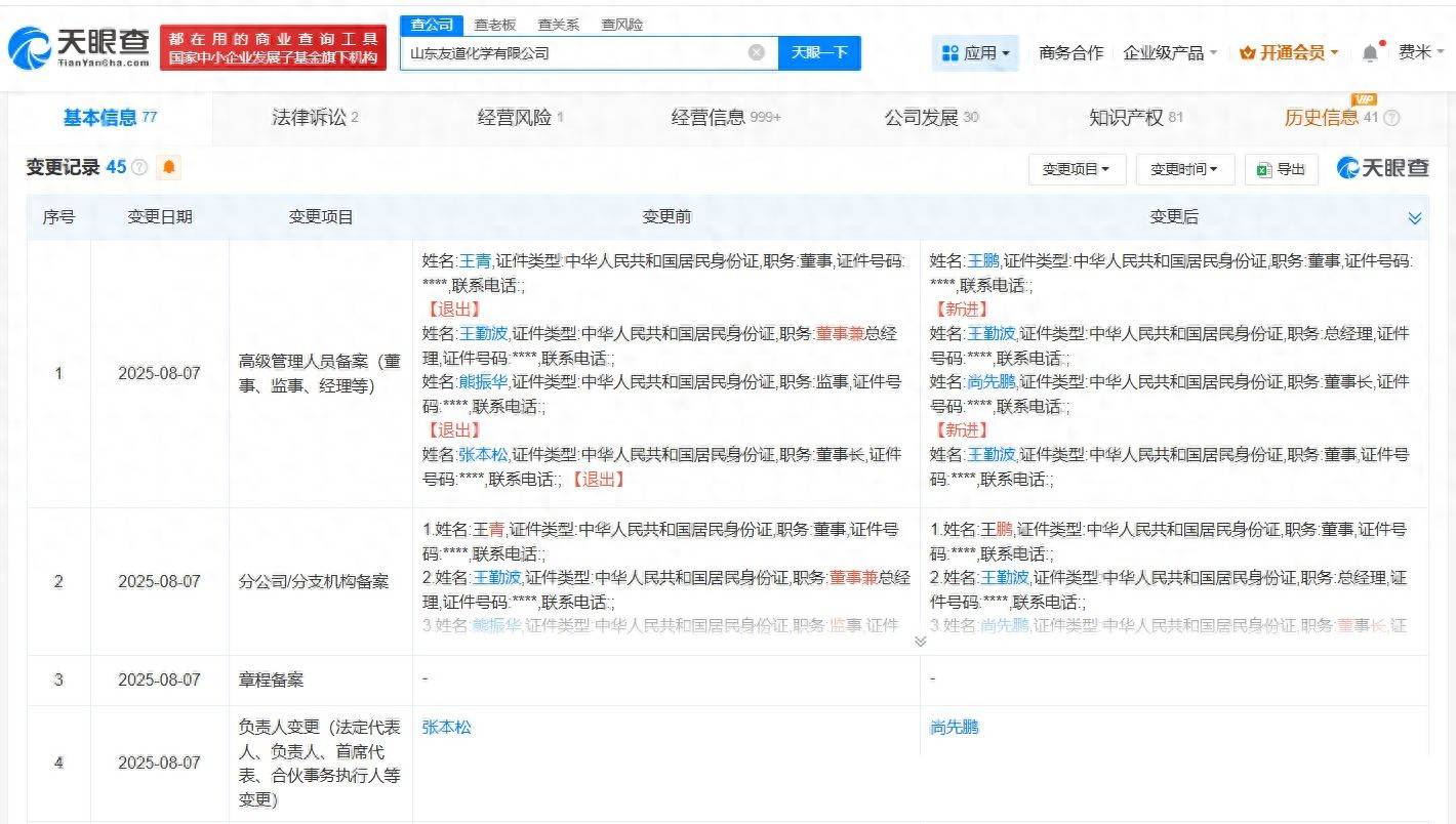 近日,山东友道化学有限公司的工商信息发生了重要变动。据天眼查App的最新数据显示,公司法定代表人及董事长一职已由张本松变更为尚先鹏,同时,公司内部的部分主要管理人员也进行了相应的调整。