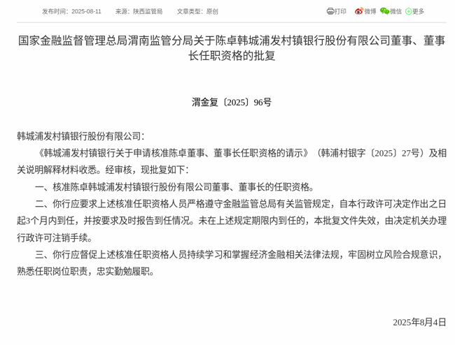 批复还特别强调,韩城浦发村镇银行应督促陈卓持续学习经济金融相关法律法规,增强风险合规意识,熟悉并掌握董事长的岗位职责,以确保其能够忠实勤勉地履行职责。这一任命不仅体现了监管机构对韩城浦发村镇银行人事管理的高度重视,也彰显了对高管人员专业素养和职业操守的严格要求。