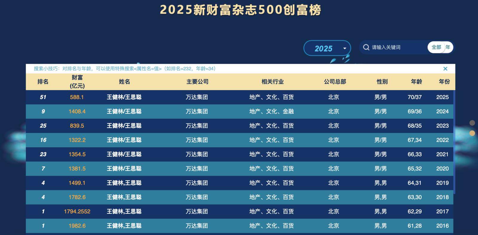 然而,尽管王健林曾多次问鼎中国首富之位,但如今的财富状况却大不如前。根据最新发布的《2025新财富500创富榜》显示,王健林父子的财富仅为588.1亿元。与上一年度的1408.4亿元相比,短短一年内身家大幅缩水超过820亿元,排名也从上年的第9名急剧下滑至第51名。