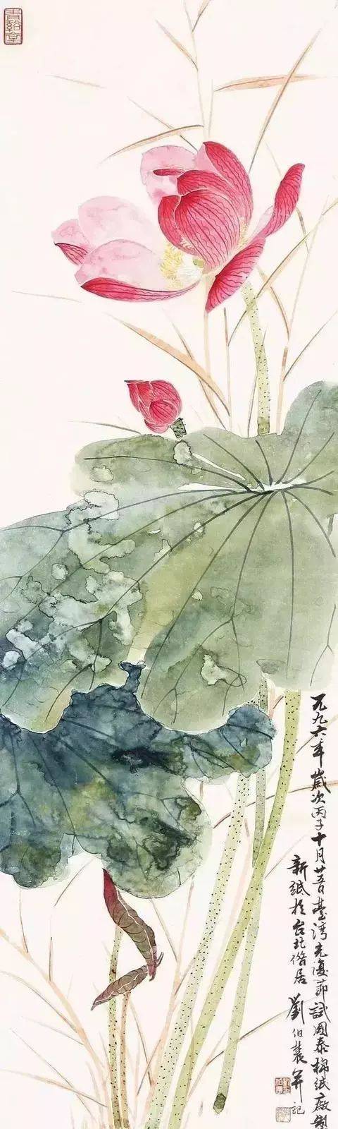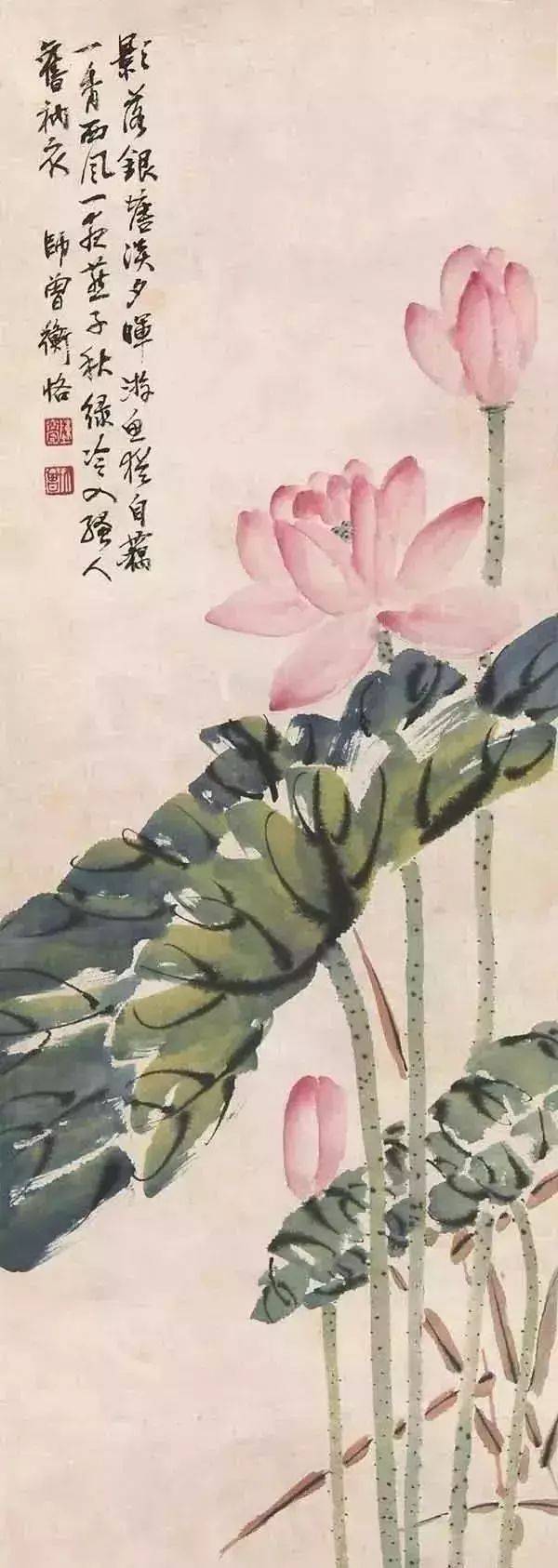 陈师曾的《荷花》以没骨写法,笔笔精到,绿叶与红荷相映成趣,散发出文人特有的清雅气息,令人心旷神怡。