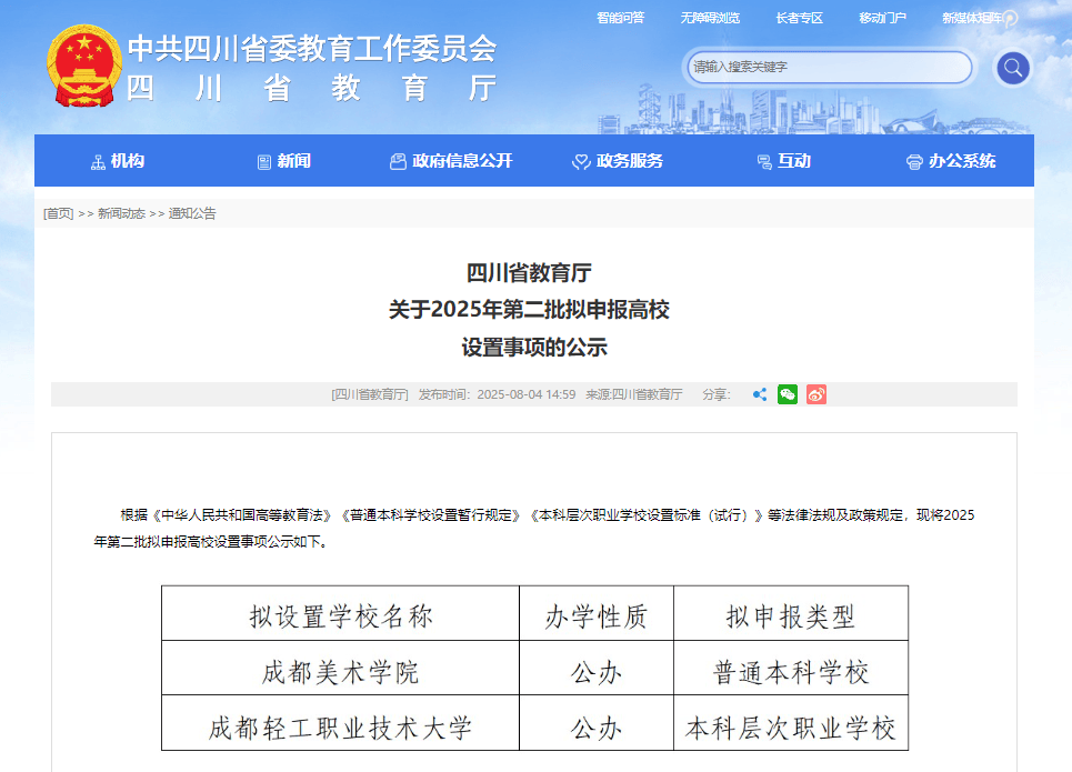 紧随其后,四川省也传来好消息。8月4日,四川省教育厅公示了2025年第二批拟申报高校设置事项,其中成都轻工职业技术大学榜上有名。该校将以成都纺织高等专科学校为基础设置,为四川省的职业教育增添新的活力。