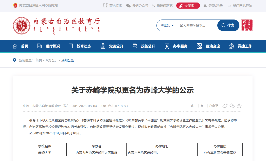 在学院更名大学方面,同样传来不少好消息。8月4日,内蒙古自治区教育厅公示了赤峰学院拟更名为赤峰大学的事项。这一更名不仅是对学校办学实力的认可,也将进一步提升学校的知名度和影响力。