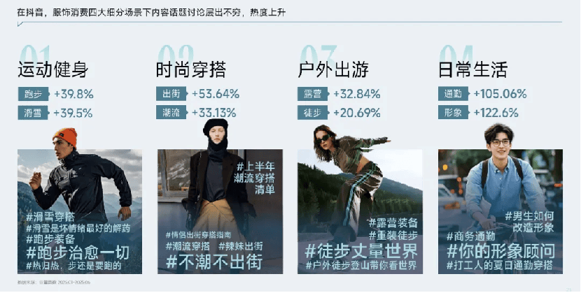 尽管市场看似仍处于复苏阶段,但其增长速度已明显放缓。2025年上半年,全国服饰鞋帽类零售额的同比增长率仅为3.1%,与2023年15.5%的高增长形成鲜明对比。然而,在抖音平台上,高端户外鞋服的GMV却同比暴涨80%,多个中高端运动户外品牌也实现了线上销售额的快速增长。