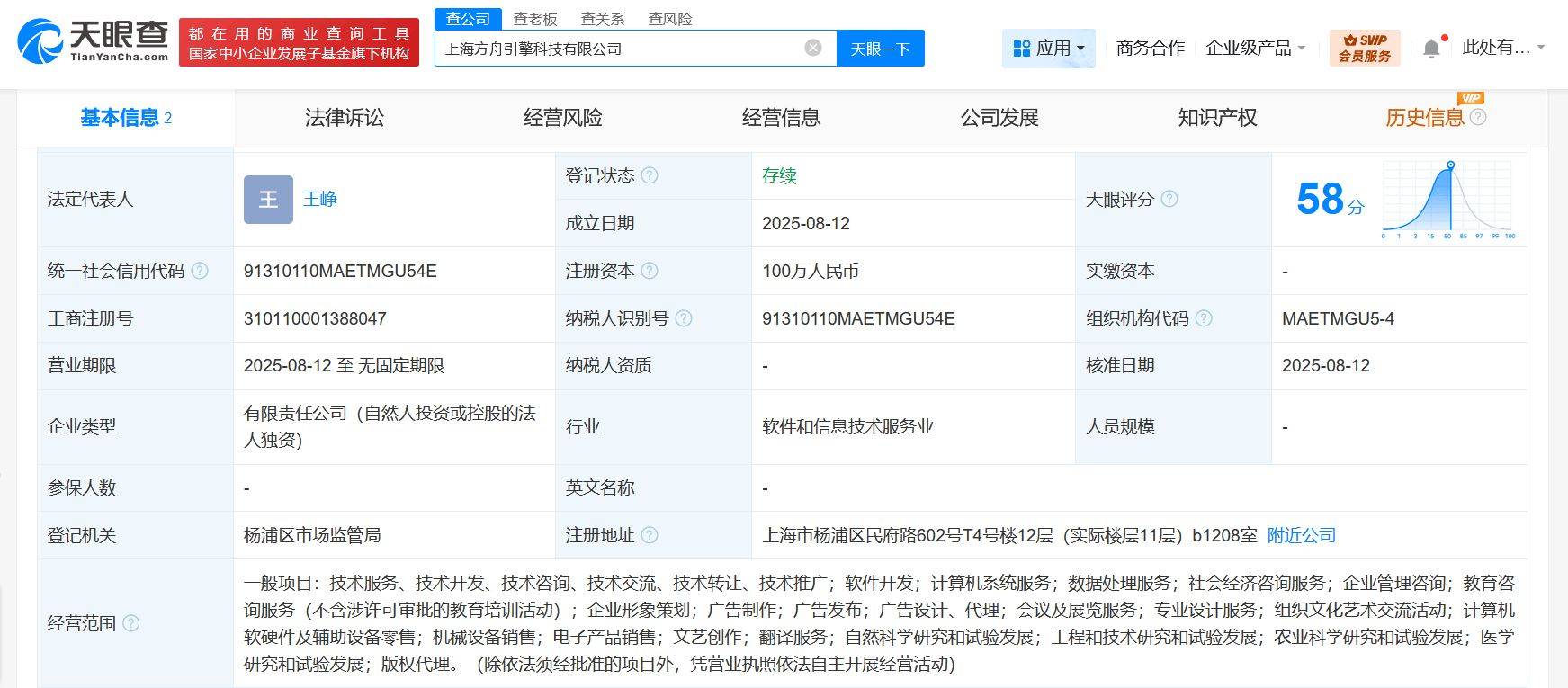 近期,一家名为上海方舟引擎科技有限公司的新企业正式宣告成立,该公司的法定代表人由王峥担任,注册资本为一百万元人民币。据天眼查平台所披露的工商信息显示,这家新兴企业的业务范围颇为广泛。