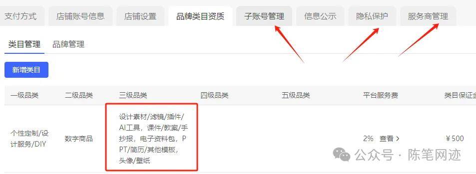 开店之后,老陈便着手进行店铺设置。他提到,需要仔细填写包括店铺名称、简介等在内的关键信息,并展示了相关的设置截图。完成这些基础设置后,他进入了店铺管理页面,着重进行了类目选择等后续设置。