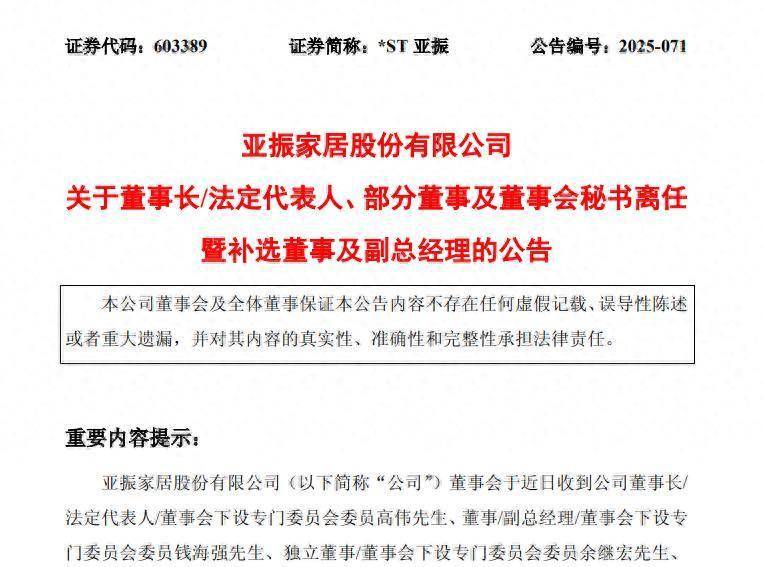 近期,亚振家居发布了一则重要公告,宣布了一系列高层人事调整。高伟因工作调整,申请辞去董事长及法定代表人等职务,但仍将继续在公司担任设计研发总监的角色。与此同时,钱海强和黄周斌也分别辞去了董事和董事会秘书的职位,但他们仍将在公司内担任副总经理和财务总监。