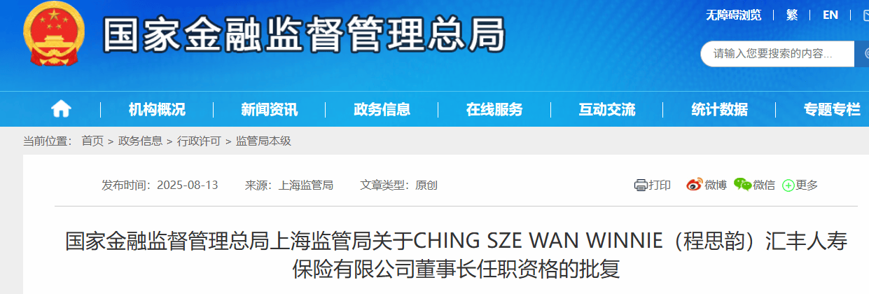 据悉,CHING SZE WAN WINNIE(程思韵)在经过严格的审核流程后,其担任汇丰人寿保险有限公司董事长的任职资格得到了国家金融监督管理总局的正式核准。