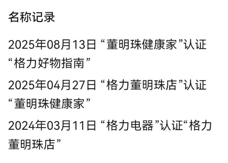 这一变动标志着该公众号在短短一年多时间内经历了第三次更名。回溯过往,该公众号最初名为“格力电器”,于2024年3月11日首次更名为“格力董明珠店”。随后,在2025年4月27日,其名称再次调整为“董明珠健康家”。