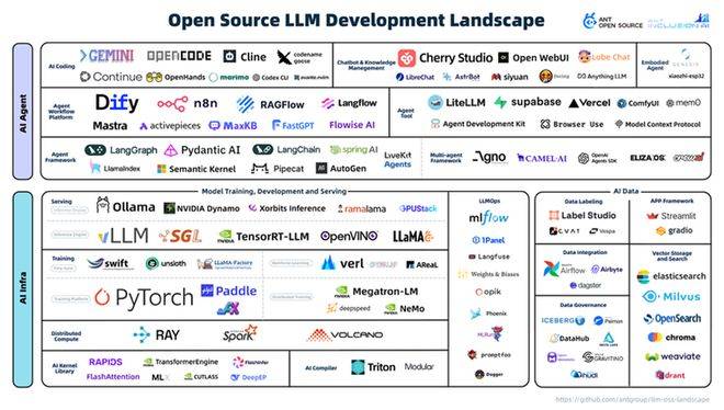 最新发布的大模型开源全景图2.0版本显示,当前生态已形成AI Agent与AI Infra两大技术方向,覆盖22个细分领域,共收录114个核心开源项目。值得关注的是,62%的开源项目诞生于2022年10月ChatGPT发布之后,平均"年龄"仅30个月,凸显出AI技术迭代的高速度。这种快速演进特性在AI编程工具领域尤为显著——2025年新出现的工具平均获得超3万开发者星标关注,其中Google推出的Gemini CLI开源3个月即突破6万星标,成为增长最快的项目之一。