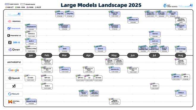 同步发布的大模型发展时间线全景图,系统梳理了2025年以来全球主流厂商的技术发布轨迹。该图不仅标注了开放参数模型与闭源模型的关键参数信息,更揭示出五大技术趋势:中美开源闭源路线分化加剧、MoE架构推动参数规模化发展、强化学习提升推理能力、多模态模型成为主流、评价体系形成主观投票与客观评测双轨模式。这些动态为理解当前技术竞争格局提供了可视化参考。