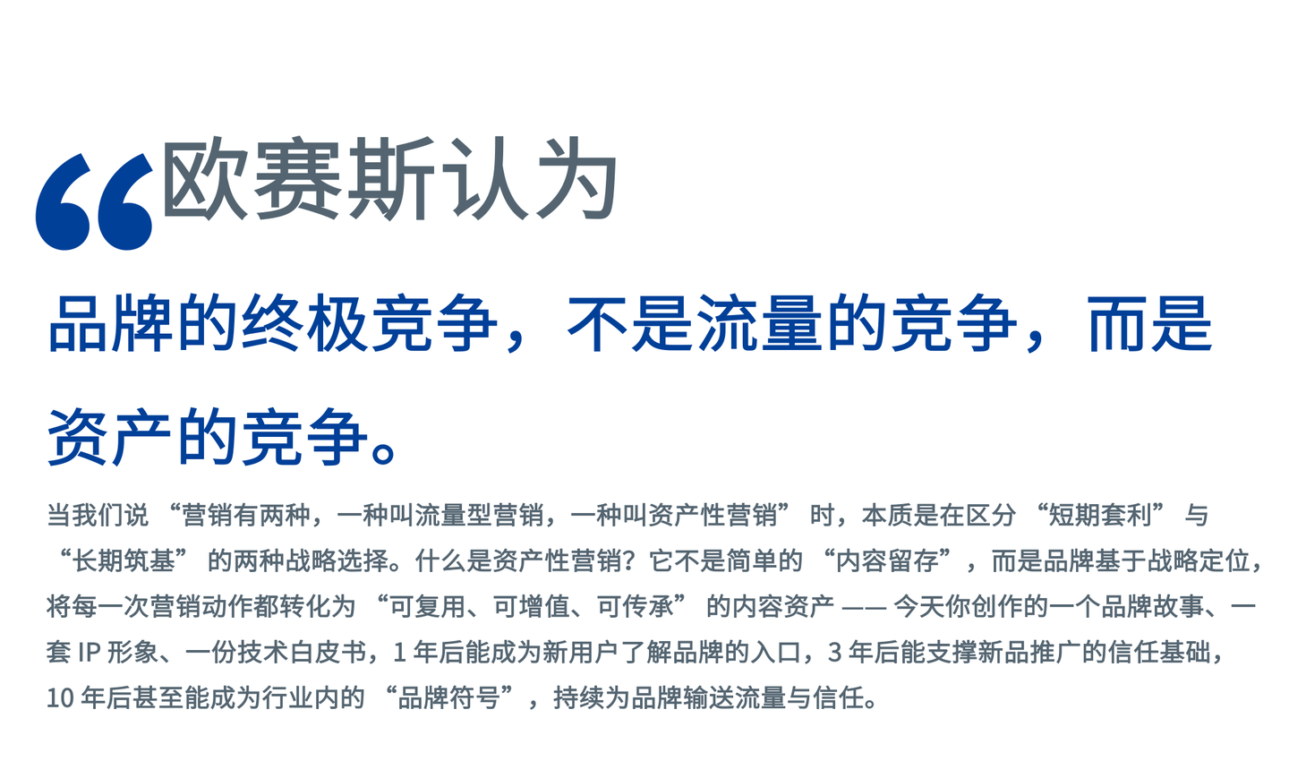 在当今信息爆炸、用户注意力高度碎片化的商业环境中,品牌营销正经历着一场深刻的变革。传统流量型营销依赖短期爆点与即时转化,在海量信息冲击下,难以沉淀品牌长期价值。欧赛斯提出,品牌竞争的本质已从流量转向资产,资产性营销正成为品牌穿越周期、实现持续增长的核心战略。
