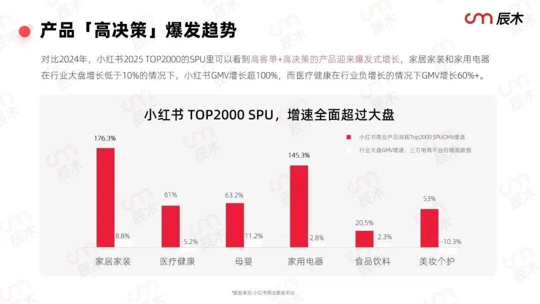 高客单价商品迎来爆发期成为最显著特征。数据显示,在行业整体增速低于10%的背景下,家居家装和家用电器品类GMV同比增长超100%,医疗健康领域更是在行业负增长情况下实现60%以上增长。TOP2000商品榜单中,智能家电、高端家具、专业医疗设备等高决策成本产品占比显著提升,消费者对品质生活的追求直接推动相关品牌进行产品升级和服务优化。