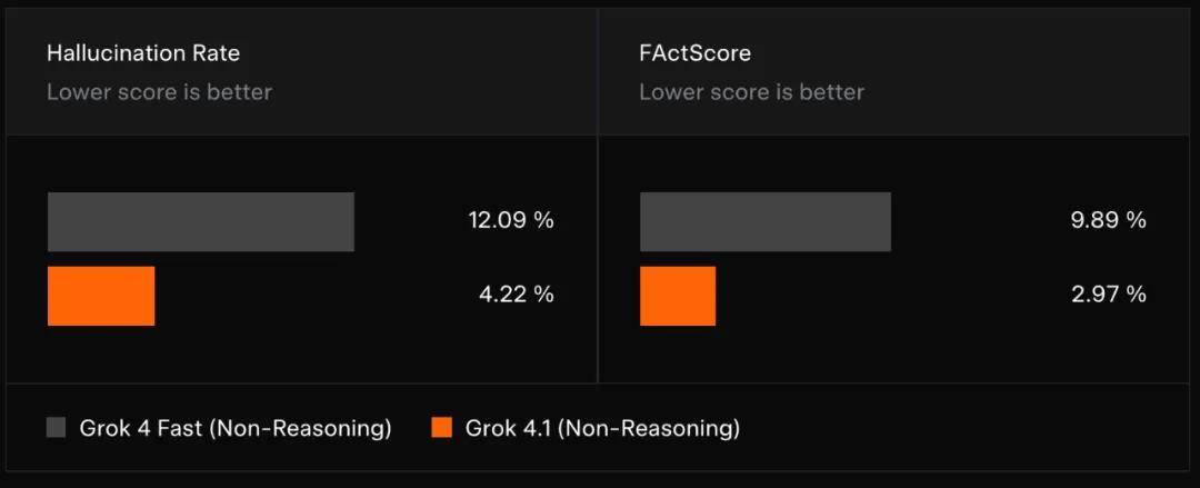 针对配备搜索工具的 Fast(非推理)模型易出现事实性错误的问题,xAI 在 Grok 4.1 的后训练过程中着重降低信息查询类提示的事实幻觉。通过按类别分层抽样评估模型幻觉率,并评测 FActScore(包含 500 个关于不同人物的传记类问题的公共基准测试),观察到生产环境信息查询提示中幻觉率显著下降。
