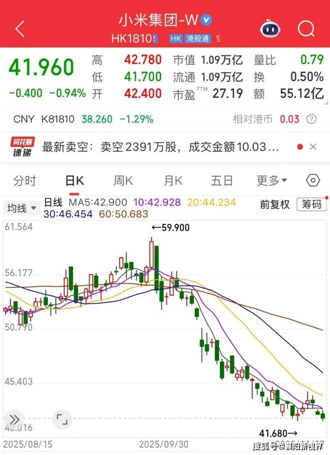外界舆论似乎也对小米的股价产生了影响。数据显示,10月以来小米股价持续下滑,截至11月17日收盘,股价为41.96港元,下跌0.94%。若从9月25日的59.45港元计算,这两个多月里小米股价跌幅已接近三成(29.4%)。