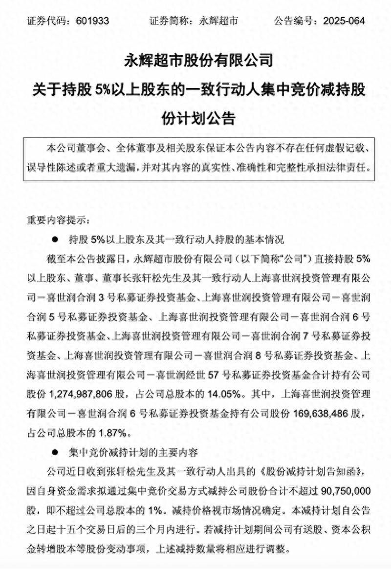 永辉超市近期因高管连续减持股份引发市场关注。根据该公司最新公告,董事长张轩松及其一致行动人计划通过集中竞价方式减持不超过9075万股,占公司总股本的1%。此次减持计划基于个人资金需求,减持价格将根据市场情况确定,实施窗口期为公告发布后十五个交易日起的三个月内。