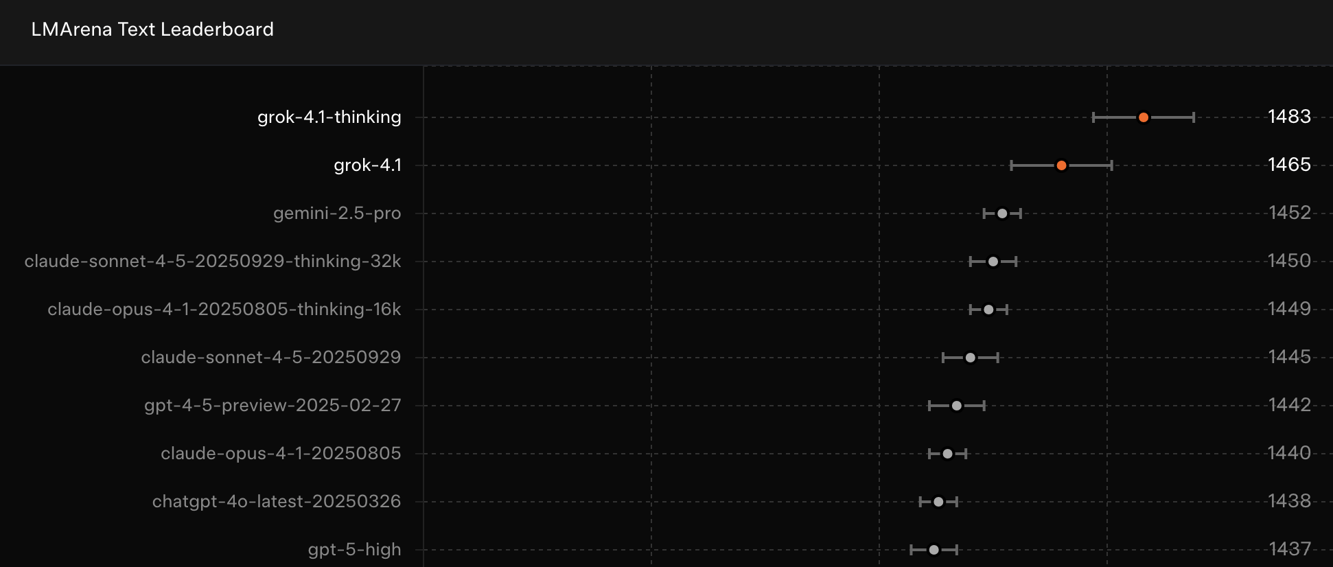 据xAI官方披露,Grok 4.1分为Thinking(推理版)和标准版两个版本,目前已通过Grok官网、X社交平台及移动端应用向全球用户开放免费体验。在权威评测平台LMArena的最新榜单中,推理版以1483分的成绩登顶全球大模型排行榜,较第二名Gemini 2.5 Pro高出31分;标准版则紧随其后占据亚军位置。这一结果直接改写了现有竞争格局,显示出xAI在技术迭代上的强劲势头。