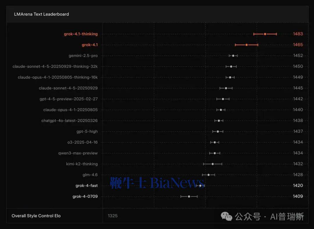 根据xAI公布的测试数据,Grok 4.1在四大权威榜单中登顶。在Arena竞技场榜单中,该模型以1483分的Elo评分位居第一,其衍生版本Grok 4.1-thinking紧随其后,较排名第三的非xAI模型领先31分,形成显著优势。情绪智商测试EQ-Bench中,Grok 4.1-thinking以1586分刷新纪录,在情绪识别、共情能力及人际理解等维度展现卓越表现。创意写作测试Creative Writing V3显示,新模型得分达1722分,较上一代暴涨600分,性能直逼早期GPT-5.1 Polaris。官方宣称Grok 4.1的幻觉率较早期版本降低超3倍,成为该系列中最可靠的模型。