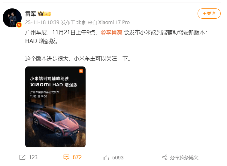 小米集团创始人雷军近日通过社交媒体平台宣布,其自主研发的端到端辅助驾驶系统HAD增强版将于11月21日在广州国际车展正式亮相。这一消息引发行业广泛关注,标志着小米在智能驾驶领域的技术迭代进入新阶段。