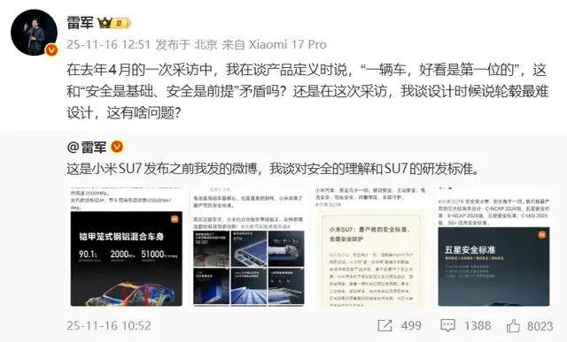 尤其对小米汽车而言,当下舆论环境对营销话题高度敏感。SU7发布以来,小米汽车凭借高性价比收获关注,但也伴随“过度营销”“情怀绑架”质疑。此时小米最需用硬实力弱化营销争议,而非在话术层面与网友纠缠。若雷军此次发布的是小米在电池热管理技术上的新突破、SU7碰撞测试具体数据或自动驾驶系统安全升级成果,效果会截然不同。这些内容既能呼应小米“安全高于一切”的理念,又能将舆论焦点引导至产品本身,既打动潜在消费者,又能堵住质疑者之口。