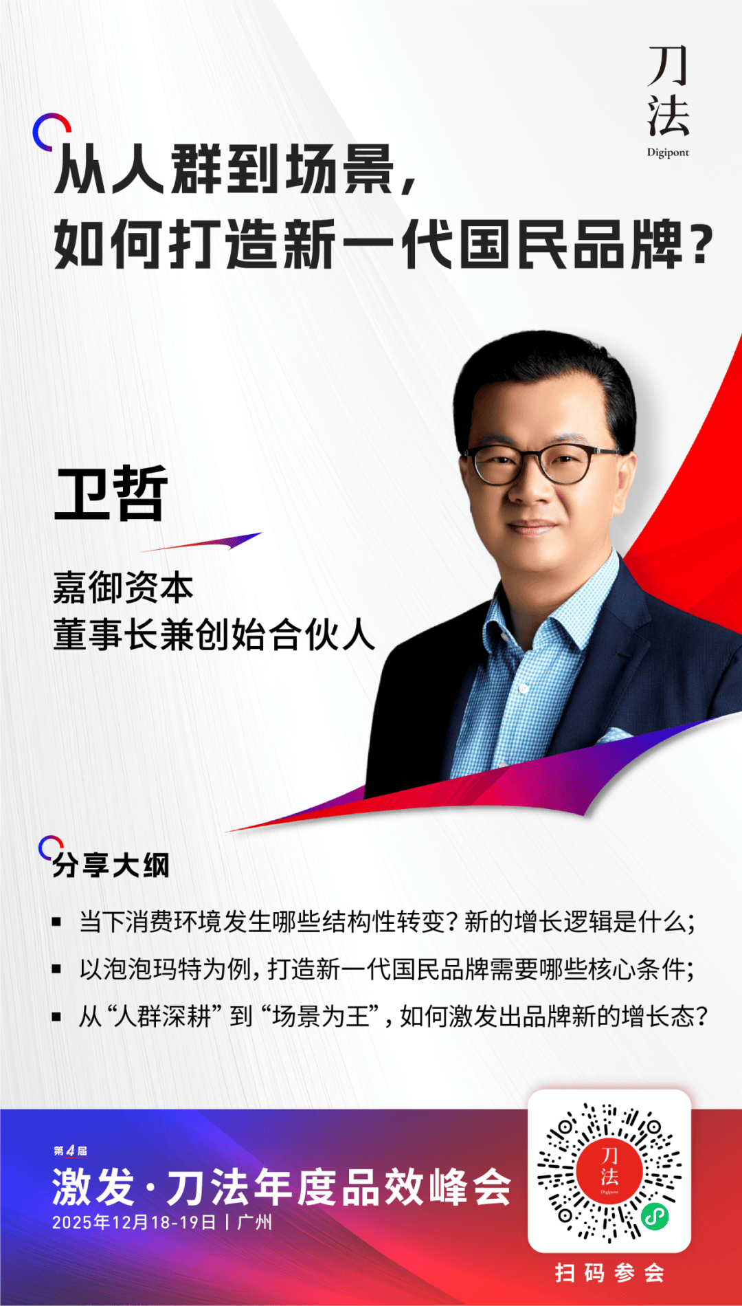 12月18日至19日,卫哲将亮相某行业峰会,以《从人群到场景,如何打造新一代国民品牌?》为主题发表演讲。他将结合消费市场最新动态,解析品牌突围的新路径,探讨未来发展的关键要素。这场演讲被视为消费行业的重要风向标,尤其关注存量经济下品牌如何通过场景创新实现破圈增长。