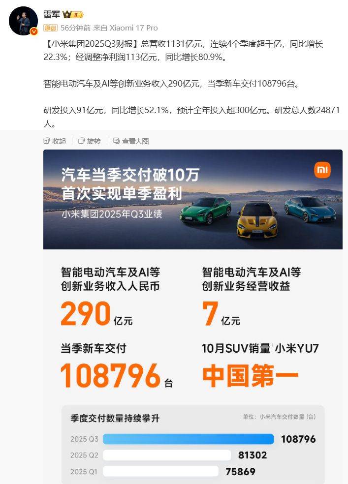 小米集团董事长雷军通过社交媒体平台发布消息称,2025年第三季度集团总营收1131亿元,连续四个季度超千亿元,经调整净利润同比增长80.9%。他特别提到,智能电动汽车及AI创新业务收入达290亿元,当季新车交付量为108796台。