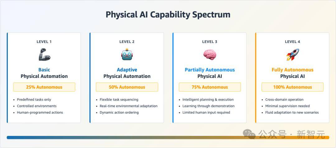 传统AI模型依赖互联网文本数据,通过识别语言模式模仿人类对话,但始终停留在“语言世界”。而实体AI的目标是让机器具备感知、理解、推理和执行复杂任务的能力,真正参与物理世界的操作与决策。例如,亚马逊提出的实体智能能力层级中,完全自主AI(Level 4)可在陌生环境中自由运行,目前多数商用产品仍处于基础自动化(Level 1)或自适应自动化(Level 2)阶段,但行业正加速向高级阶段迈进。