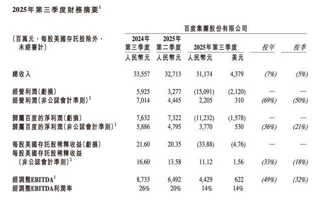 百度集团(9888.HK)最新发布的2025年第三季度财报显示,公司净利润出现罕见亏损,引发市场关注。财报数据显示,今年前三季度百度集团总收入为963.4亿元,同比下降2.69%,净利润为37.6亿元。业绩下滑的主要原因是第三季度表现不佳,该季度总收入仅为311.74亿元,同比减少7%,创下季度收入最大跌幅纪录。在扣除资产减值等因素后,第三季度净亏损高达112.32亿元,而去年同期净利润为76.32亿元。