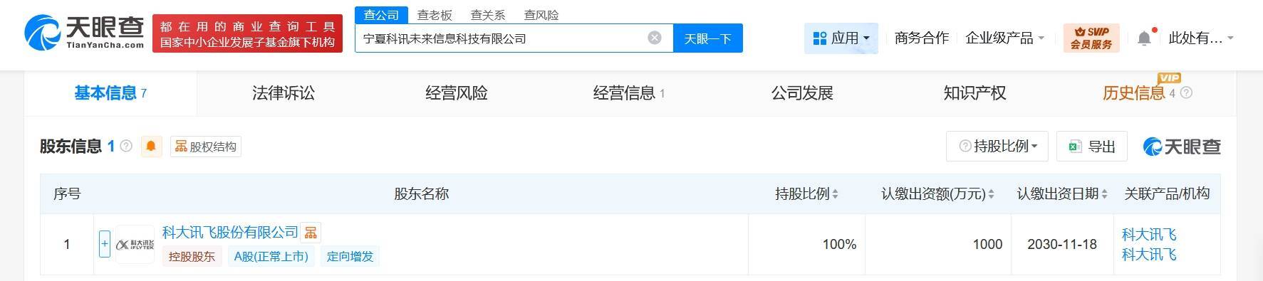 据企业信息查询平台天眼查披露,一家名为宁夏科讯未来信息科技有限公司的新企业完成工商注册登记。该企业法定代表人为程玉柱,注册资本达1000万元人民币,由科大讯飞(证券代码002230)全资控股。
