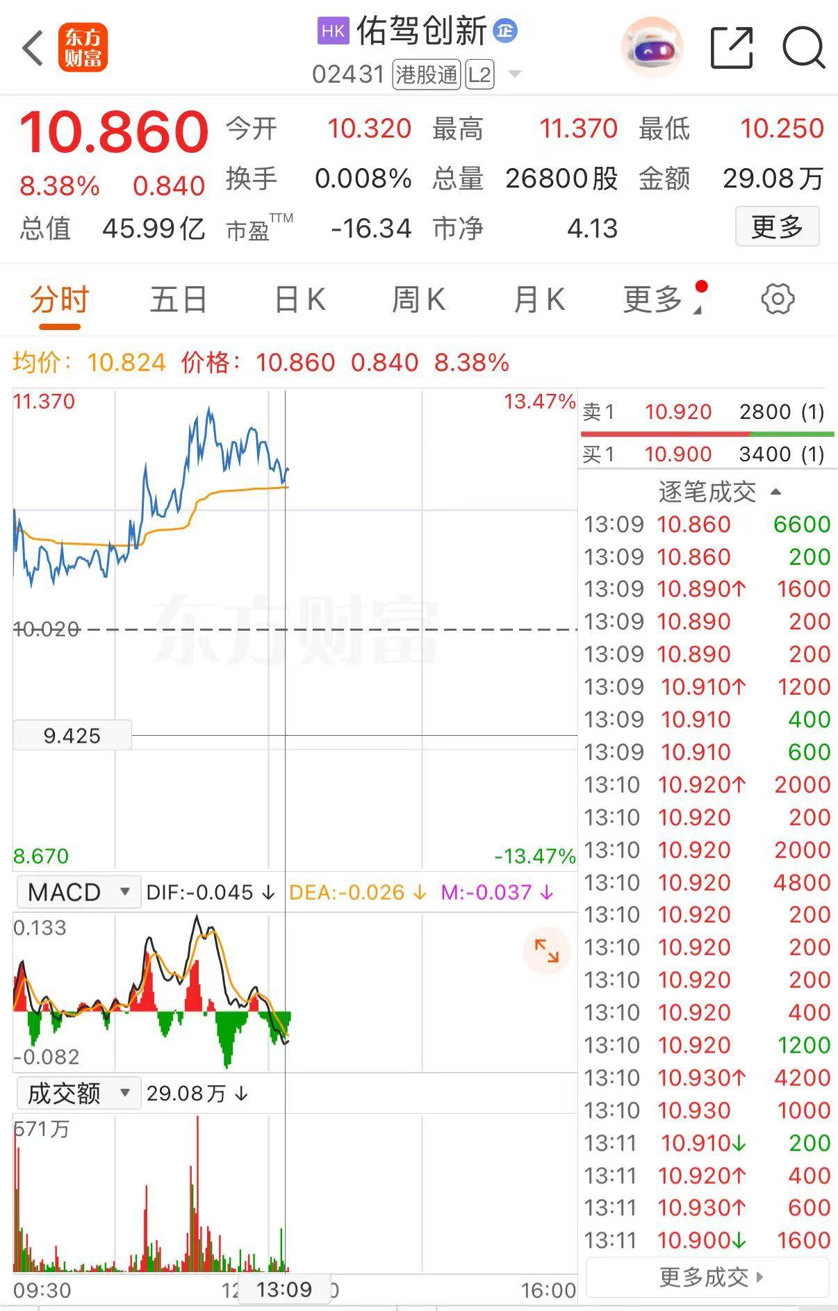 在资本市场表现方面,佑驾创新12月16日呈现出强劲的上升势头。当日盘中,其股价一度大幅上扬超过13%,最高触及11.37港元/股。到13时09分,股价依旧保持涨势,涨幅达8.38%,最终报10.86港元/股。