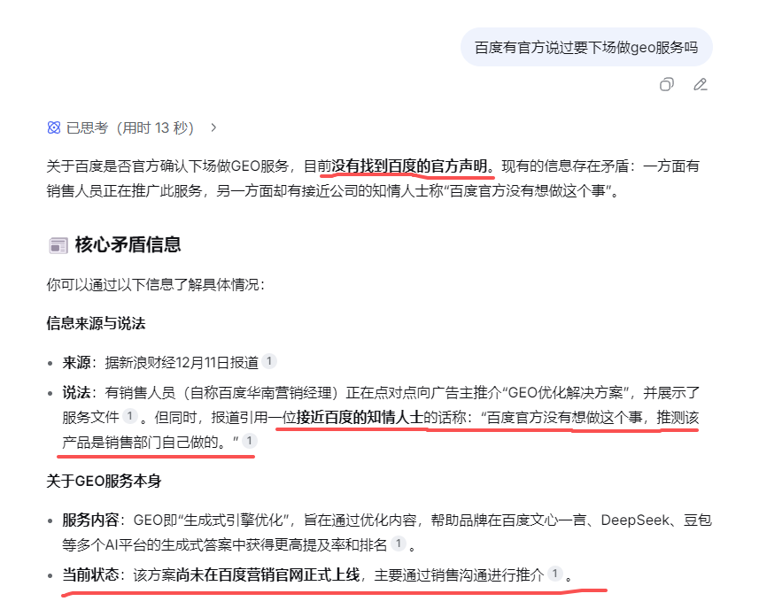 笔者认为,GEO是一种新技术,但全网对其定义都不太清晰,甚至目前出现的发软文做GEO是否属于GEO的一种,也有待考究。AI营销技术除了GEO还有其他如AISEO的技术正在发展,但相信需要再过一段时间才能稳定,真要做GEO,建议在合同上规定好交付标准再落地。截稿前笔者了解到:网传百度下场做GEO一事,目前看来不是有效信息,可能是部分做GEO系统的商家炒作作为,个人认为百度等AI厂家不会亲自下场做GEO,否则大众会质疑AI的中立性,但不排除会在AI展示位放上付费表示,这是否算下场呢?后续笔者将继续了解。