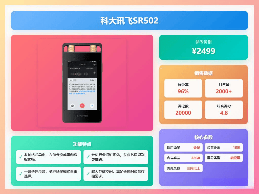 市场反馈显示,科大讯飞智能录音笔正在重塑专业录音设备标准。其将AI语音技术、硬件设计与用户需求深度融合的研发思路,为行业树立了新的标杆。随着远程办公与跨语言协作需求的增长,这类具备高精度录音与智能转写功能的设备,正成为现代职场人士的标配工具。