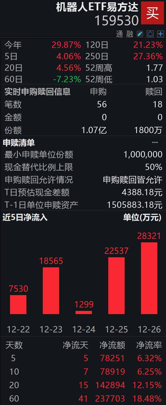 资金流向方面,跟踪该指数的机器人ETF易方达(159530)持续获得市场青睐。数据显示,该ETF已连续五个交易日实现资金净流入,累计金额超过7.8亿元;近二十日净流入规模更是突破14亿元。目前,其基金规模已达138.63亿元,成为同类产品中唯一规模突破百亿元的标的。截至发稿时,该ETF盘中再获8900万份净申购。