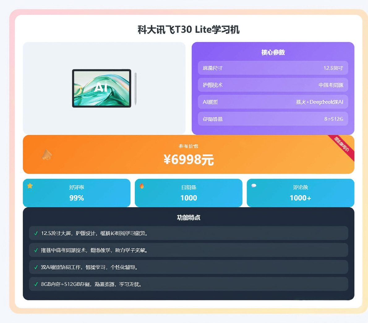 T30系列构成科大讯飞的核心产品线。标准版T30(7500元)搭载13英寸2K护眼屏,配备8GB+256GB存储组合,其AI精准学系统可覆盖小学至高中全学科知识点。通过分析5-10道测试题,系统能精准定位数理化薄弱环节,生成个性化学习路径。实测显示,使用该功能的学生平均提升23%的错题修正率。该机型还集成AI作文批改、英语口语评测等工具,成为K12阶段学生的全能学习助手。