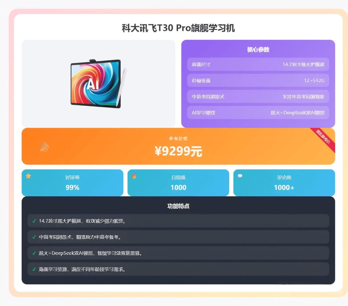 对于追求旗舰体验但预算敏感的用户,T30 Pro以8999元的价格提供超值选择。作为次顶配机型,该产品在屏幕尺寸、存储容量等非核心参数上与万元级Ultra版保持差异,但保留了95%的AI学习功能。实测表明,其知识图谱构建速度与Ultra版仅相差0.3秒/题,而价格优势达1200元。这种"旗舰体验平民化"的定位,使其成为高端市场中的性价比黑马。