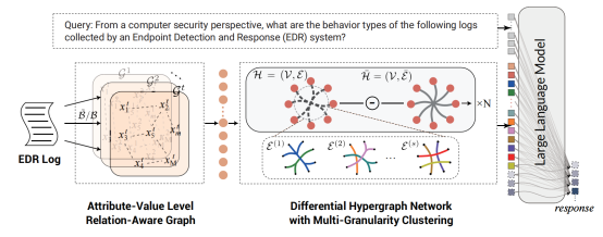 为此,360研究团队创新地将超图推理与大语言模型相结合,提出HyperGLLM框架。该框架首先构建属性-值的关系图,以捕捉低阶结构语义并减少文本冗余;随后,引入集成多粒度聚类的微分超图模块,用于捕捉交错事件中的高阶行为依赖关系;将超图增强的语义表示与大语言模型对齐,从而实现对潜在恶意行为的高效上下文推理。