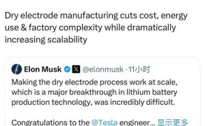 特斯拉在电池制造领域取得关键进展,其干电极工艺规模化生产被视为锂电池技术的重大突破。公司创始人马斯克在社交平台发文称,这一成果得益于工程、生产及供应链团队的协同努力,以及战略合作伙伴的技术支持。特斯拉官方随后补充说明,干电极技术可降低生产成本、能源消耗及工厂复杂度,同时提升产能扩展的灵活性。