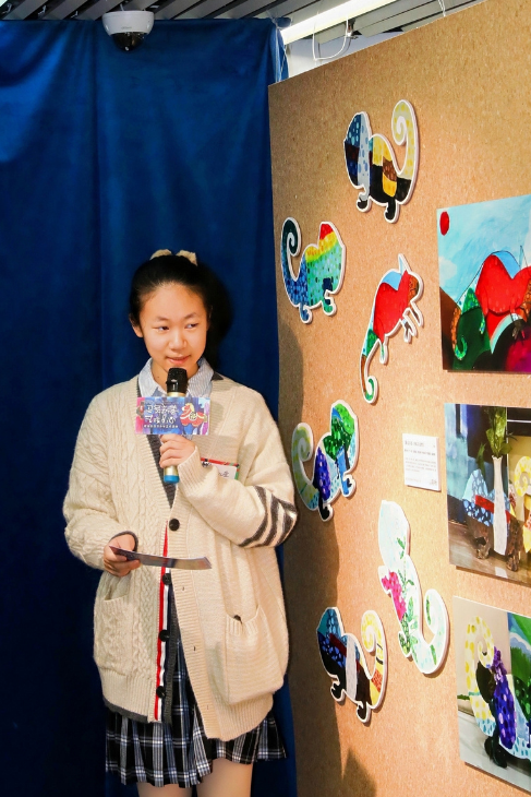 还有孩子主动担任小小导览员,站在自己的作品前,向来往的人介绍。那份认真和骄傲,是比任何画作都动人的风景。