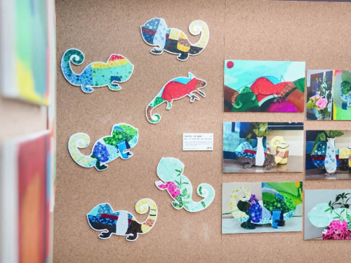 观色寻序展区,是艺术探索的第一站。观色,就是学会观察色彩的样子,感受色彩的情绪,发现颜色和世界之间的联系。从随心涂色,到慢慢学会搭配色彩、用色彩表达心情——每一幅作品,都是孩子们在蕃茄田艺术课程中对色彩的观察和理解。其中《波点变形计》系列作品,灵感来自变色龙会根据环境变颜色的特性,孩子们分析环境色彩,调配相应颜色,用大大小小、深深浅浅的波点,一层层地藏在变色龙身上,完成了一场“隐藏变色龙”的色彩游戏。