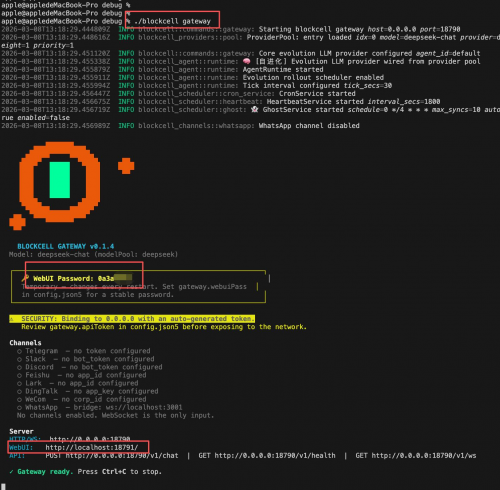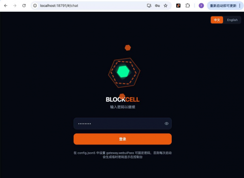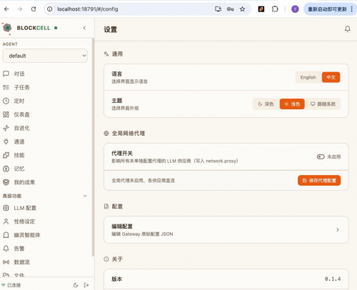 到这里,你就可以看到 Blockcell 的 WebUI,后续也可以在这里继续测试对话、查看任务状态和管理运行中的智能体。
