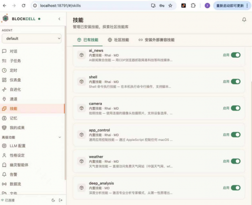 Blockcell 不只是“聊天”,而是真正能执行任务的智能体系统。它可以读写文件、处理文档、抓取网页、控制浏览器、接入多种消息渠道,并支持长期运行、WebUI、API、多 Agent 路由等完整能力。