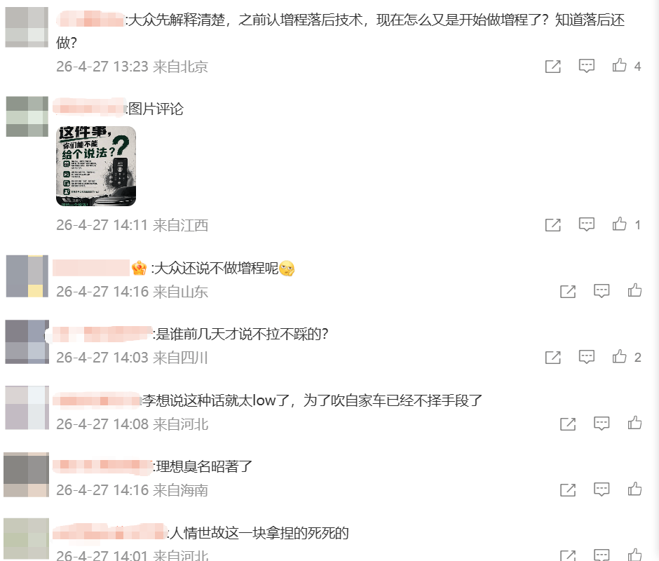 2026年4月25日,上汽大众ID.ERA 9X在北京车展正式上市,首小时锁单破万。同为6座SUV,两款车尺寸相近,动力形式均为增程,目标用户高度重叠。李想口中的“两代差距”,在不少第三方工程师看来并没有那么绝对。这场争论也引发了网友的广泛参与,有网友支持大众,认为其技术成熟可靠;也有网友支持理想,认为其智能化配置更具优势。目前,关于两款车谁更领先、领先几代的讨论仍在持续。