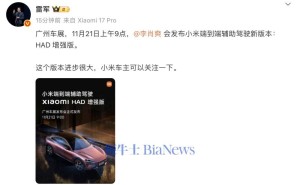 雷军官宣!11月21日广州车展将发布小米HAD增强版辅助驾驶新版本